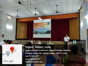 Two meritorious students of Digboi College were felicitated by Digboi College for securing the highest marks in Economics subject in the AHSEC by Dhritiman Bhattacharjee with 99 marks and Silpi Sikha Sonowal for securing the highest percentage of marks in the HS final exams within the college. Further, Dr. Dip Saikia, Principal of the college, delivered a speech on the history of Digboi College from its year of establishment. The first advisory ad-hoc governing body committee was organized in a public meeting at AOD (IOCL) School premises by some eminent personalities like educationists, social workers, and visionaries, such as Shri Satya Jiban Paul, Shri Krishna Prasad Baruah, Shri Dwijesh Chandra Deb Sarma, and others. Shri Tarun Chandra Goswami, the then DFO of Digboi Forest Division, was the first governing body President of Digboi College, and Shri Miraj Hussain, a social worker, was the secretary of the body.